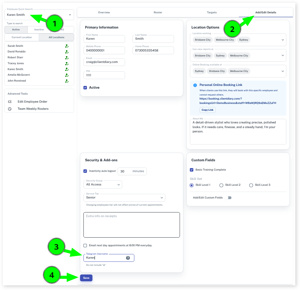 This page will step you through adding your Telegram Username to your Client Diary Employee profile. This will allow you to use the Telegram Bot on your own device.