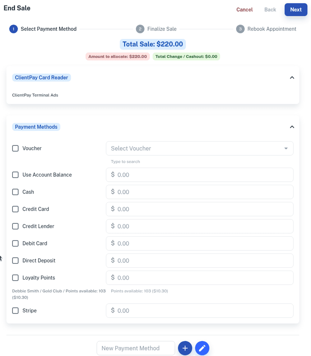 A client may want to pay partially on one card, partially on another and maybe some cash as well. Client Diary can do this quickly and easily.