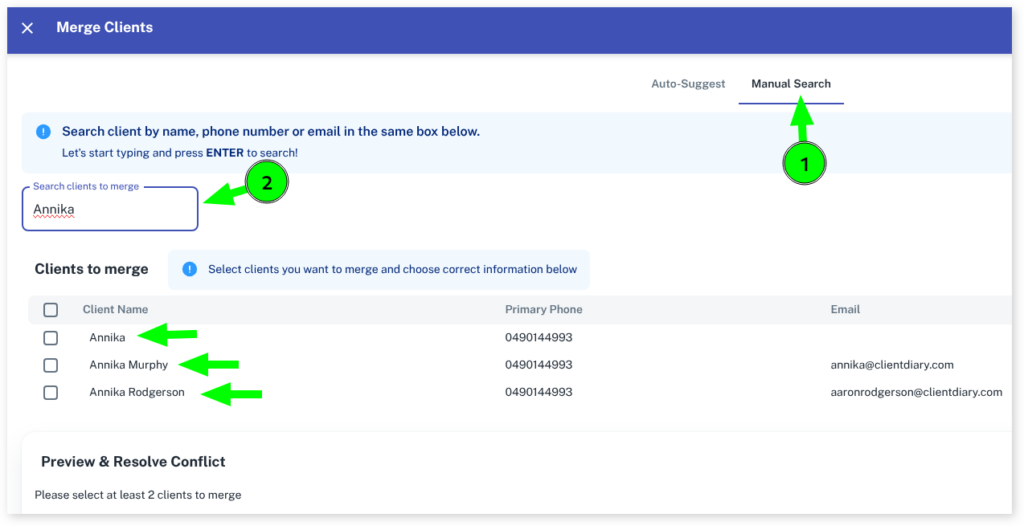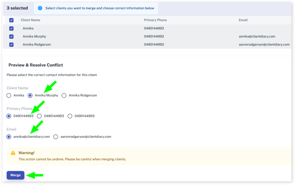 - Once you select your clients, you can now select the correct contact information for this client listed under Preview & Resolve Conflict
