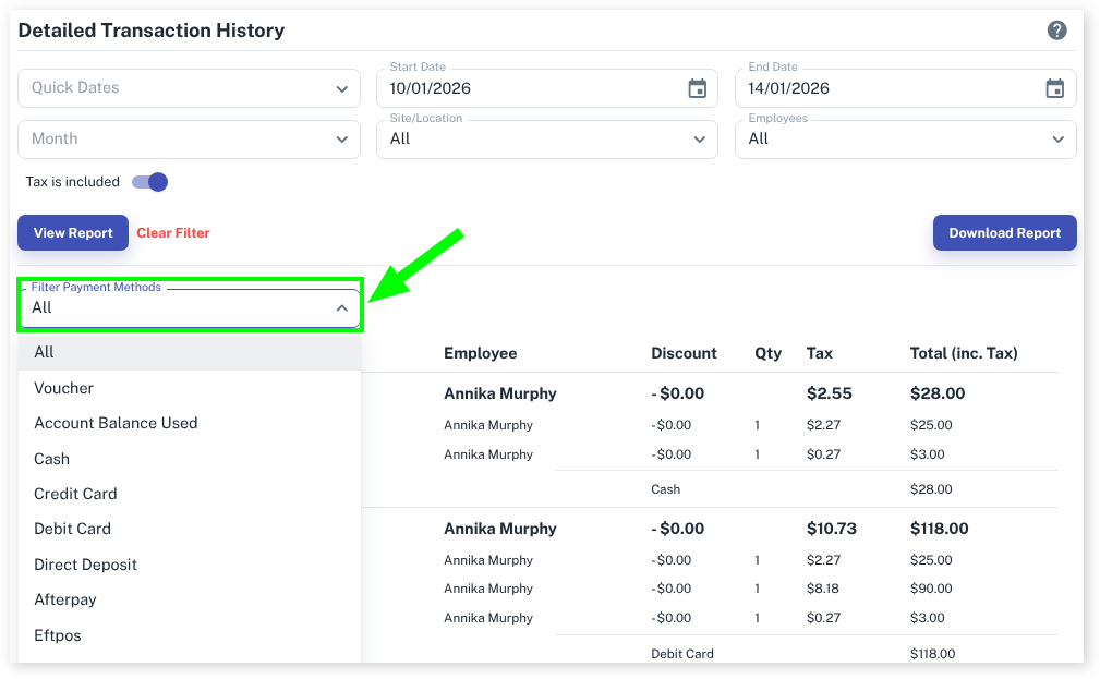 Now that you have clicked on View Report, you can use the Filter Payment Methods drop-down to further filter your transactions.
