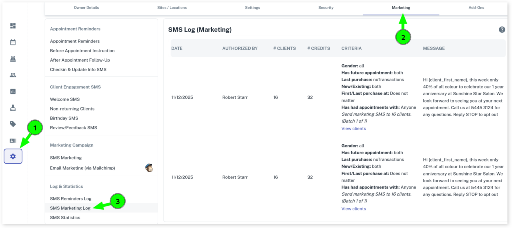 It will automatically show your previous marketing campaigns so you can keep track of what you send and when. This is very handy to check to see where any extra charges may come from, by seeing how many credits have been used you can compare it to any recent purchases of SMS credits.