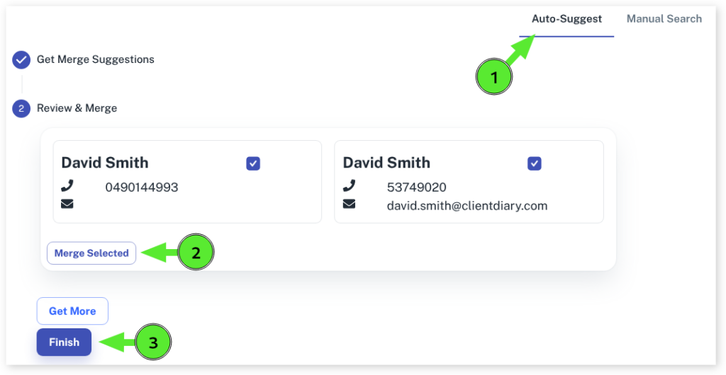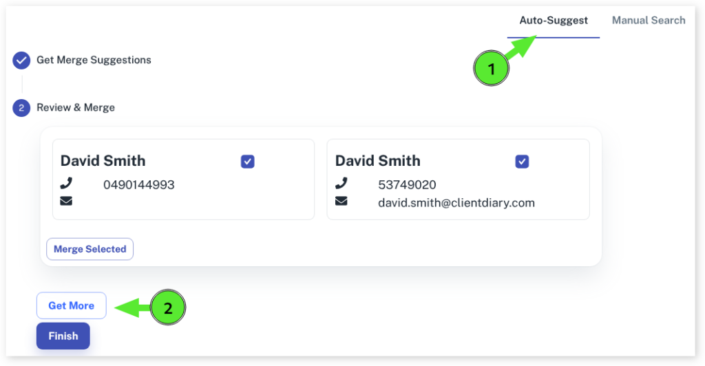 - To keep things quick, Client Diary only loads a certain number of duplicate clients at a time. To retrieve more clients in your merge list click on Get More button