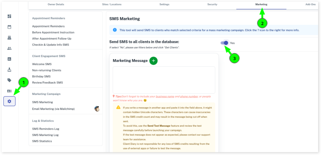 Attention: Before sending any marketing be sure to merge any duplicate clients you may have in the database. This stops clients from receiving messages twice by accident. Documentation on this is here.