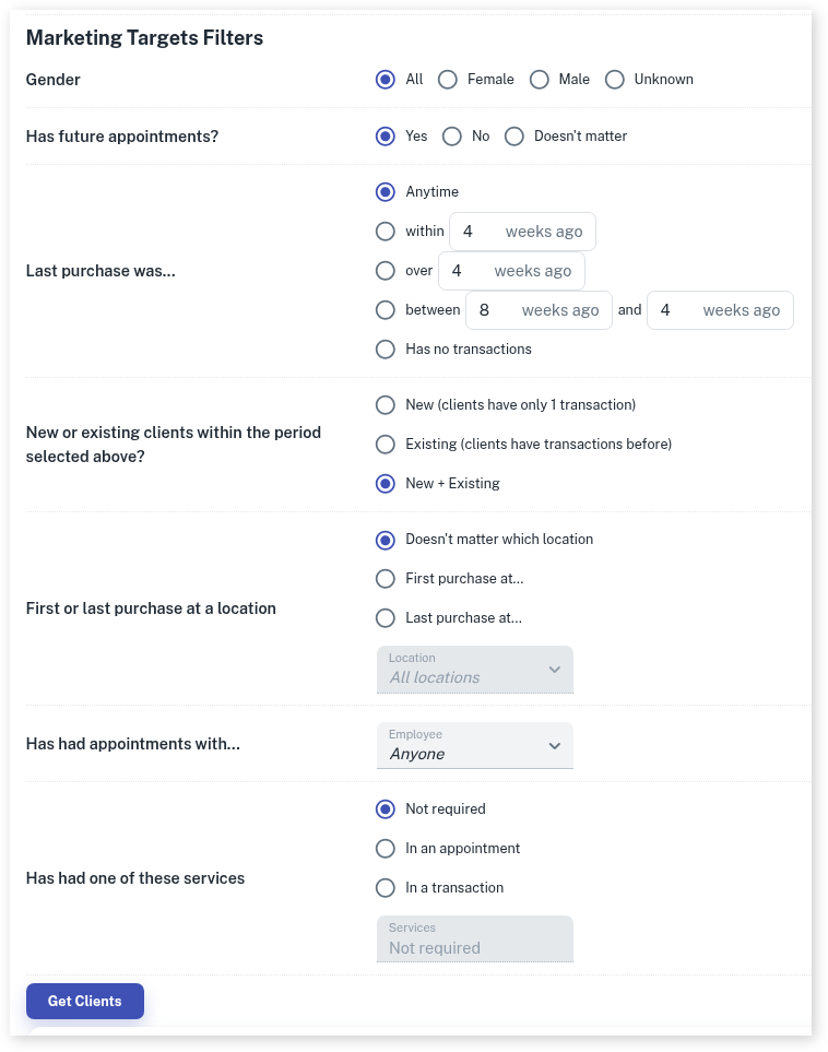 Attention: Before sending any marketing be sure to merge any duplicate clients you may have in the database. This stops clients from receiving messages twice by accident. Documentation on this is here.
