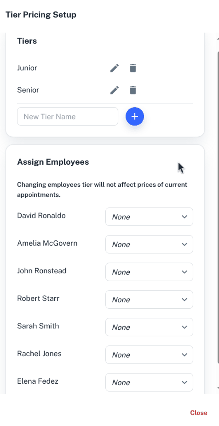 Tiered pricing allows you to have a single Service and depending on which staff the Service is booked with, it will change it’s pricing.