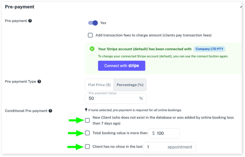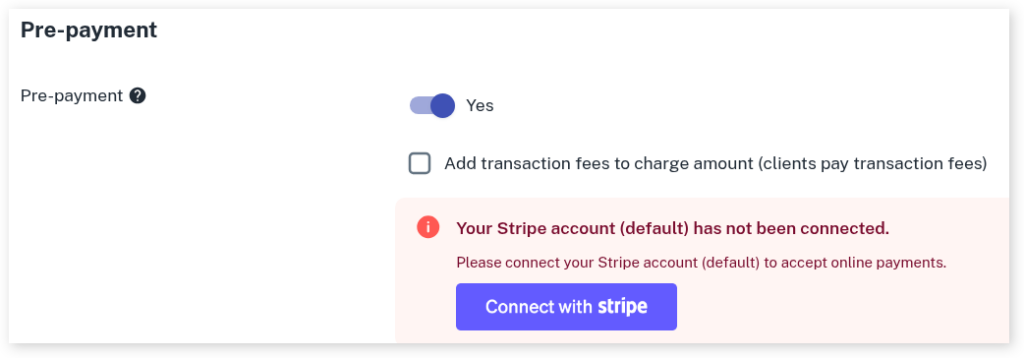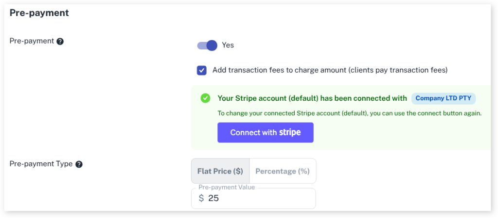 - Scroll down to the Pre-payment area and you will see there are now more options and a message stating “Your Stripe account has been connected”.