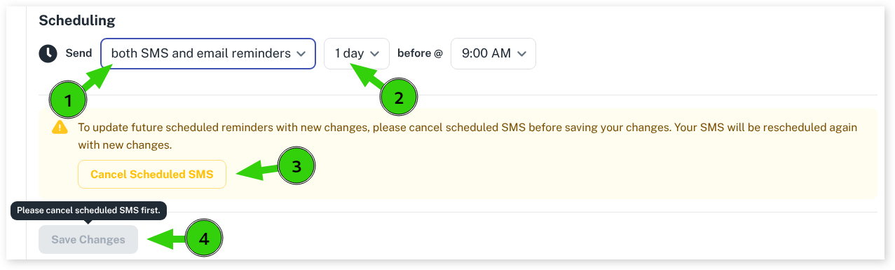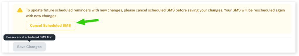 - Before clicking on the Save Changes button you will need to Cancel Scheduled SMS to update scheduled reminders with the new changes