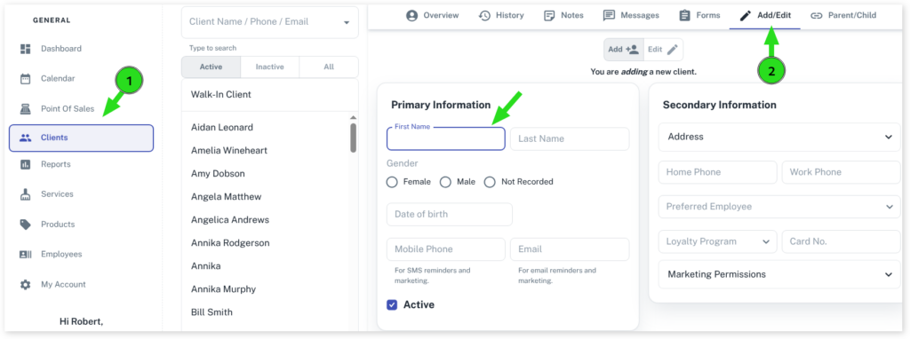 - Fill in the new client’s phone number and email if available