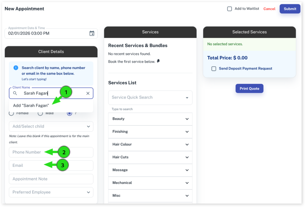 - In the New Appointment pop up enter the new Client Name and click Add