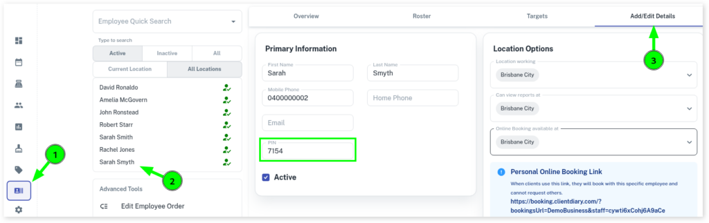 - Leave the PIN option blank as Client Diary will auto assign one after you save the employee. (See below how to view the PIN number)