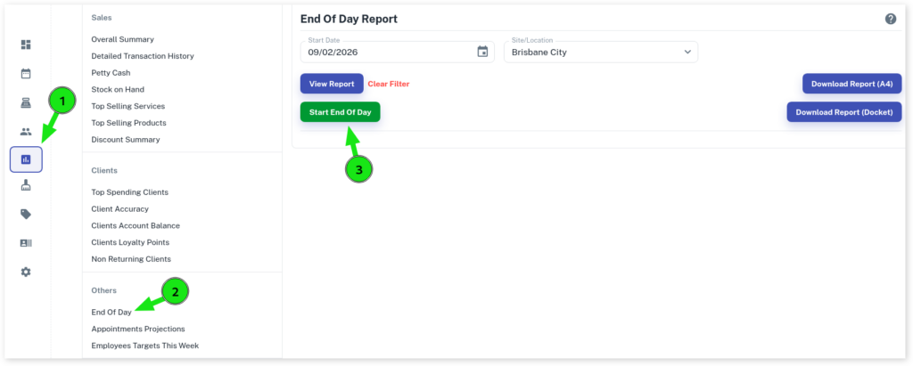 - Optional: You can leave work at night and do cashing up the next day if you require. It doesn’t HAVE to be done that day. You simply come in early the next day, before money starts transacting, select yesterday’s date and do the End of Day like normal.