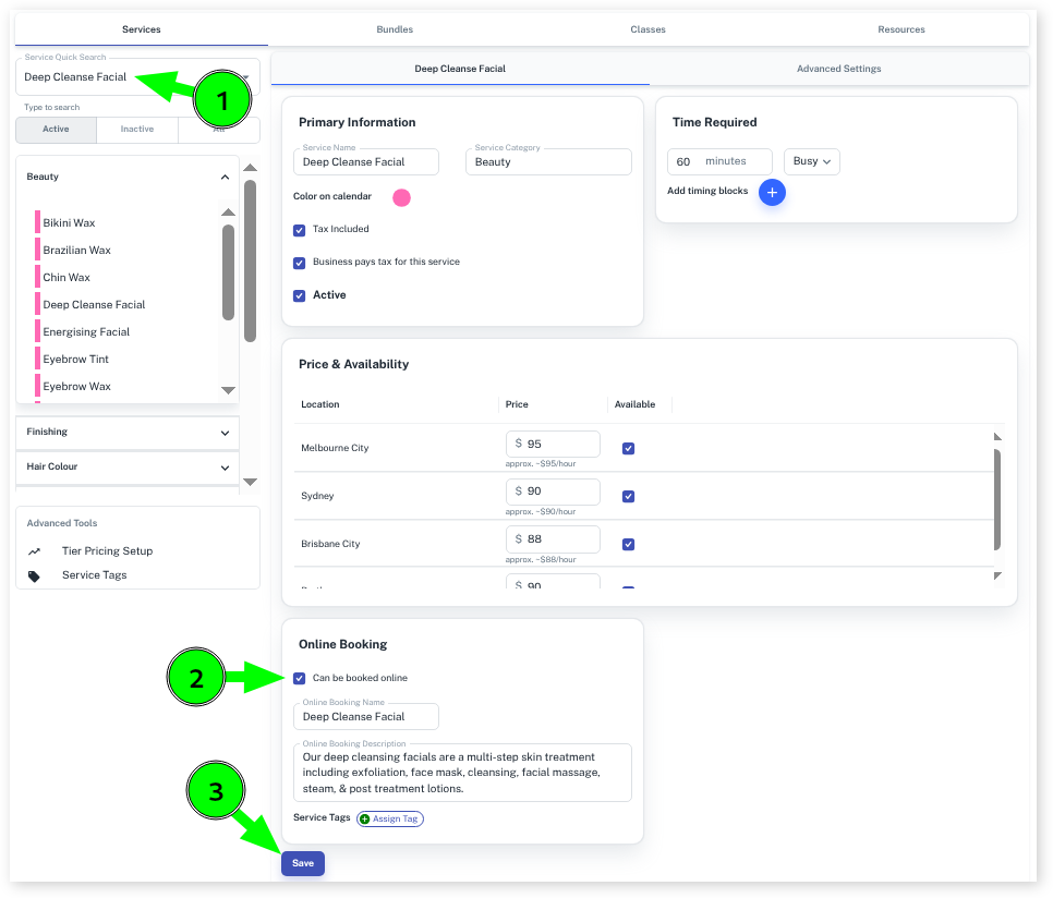 - Repeat Steps 2 to 4 for each Service you want to appear in your online booking