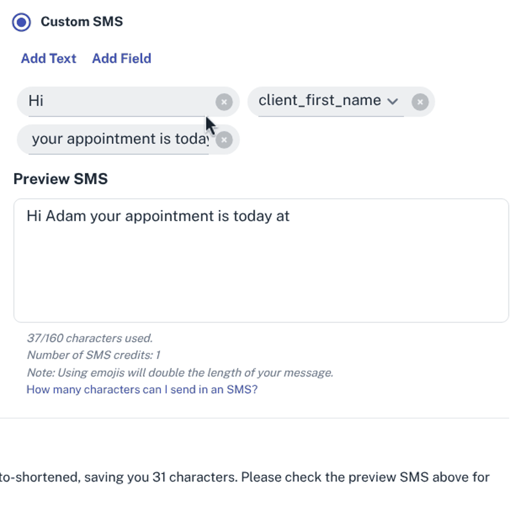 Preview SMS – This is a preview of what the SMS will look like when it is sent to your clients