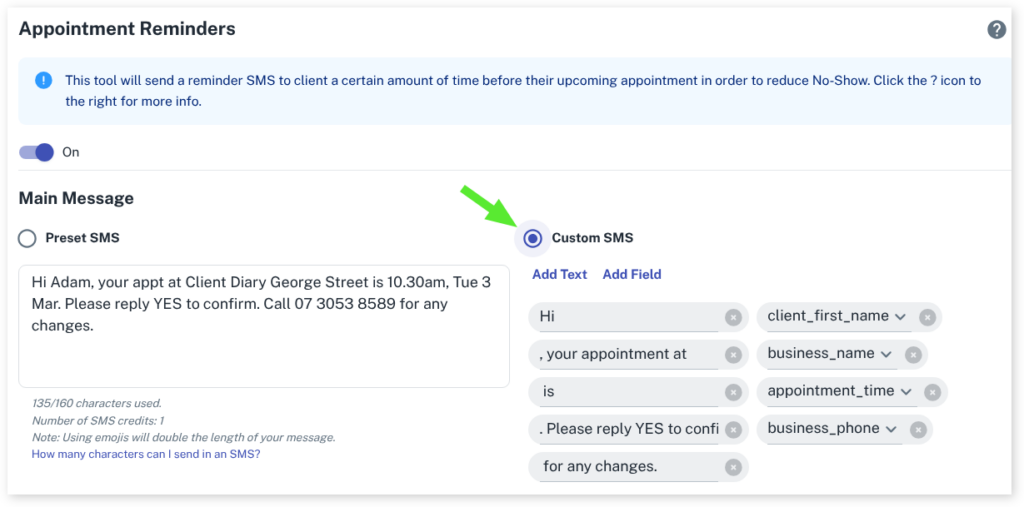 Add Field – Is a field that will add the information automatically into your SMS from information that has been added to Client Diary. For example, if you add the business name field and have added you business name to Client Diary then it will automatically add your business name to the SMS.