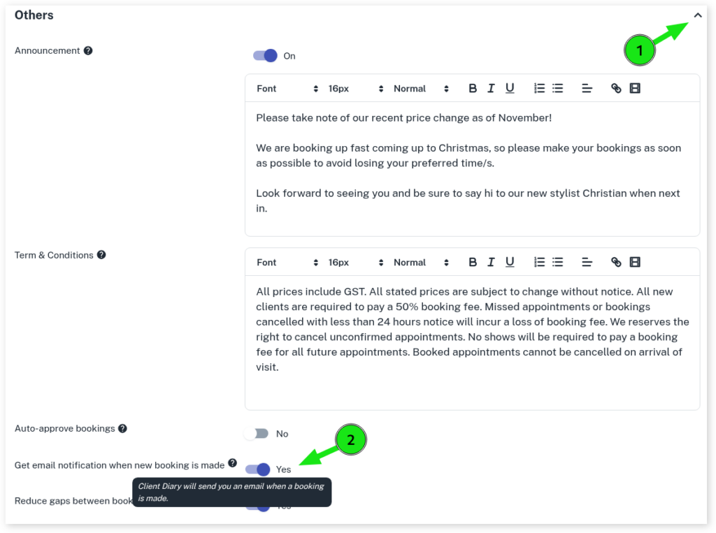 - Get email notification when new booking is made – toggle this option to Yes / No depending on your requirements