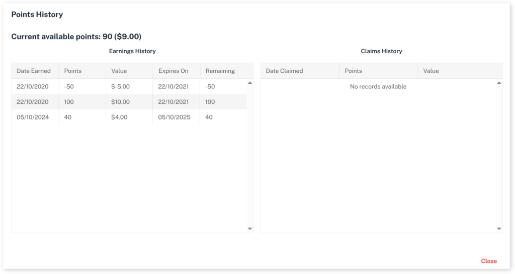 A pop up will come up showing what points the client has earned under Earning History and the points that have been redeemed under Claims History.