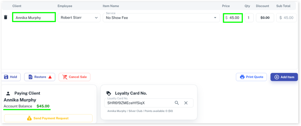 In a few situations a client may not show for an appointment. For example, a client may have paid for an appointment online and the funds have been deposited into their account and you would like to claim it as a fee against the client not showing up.