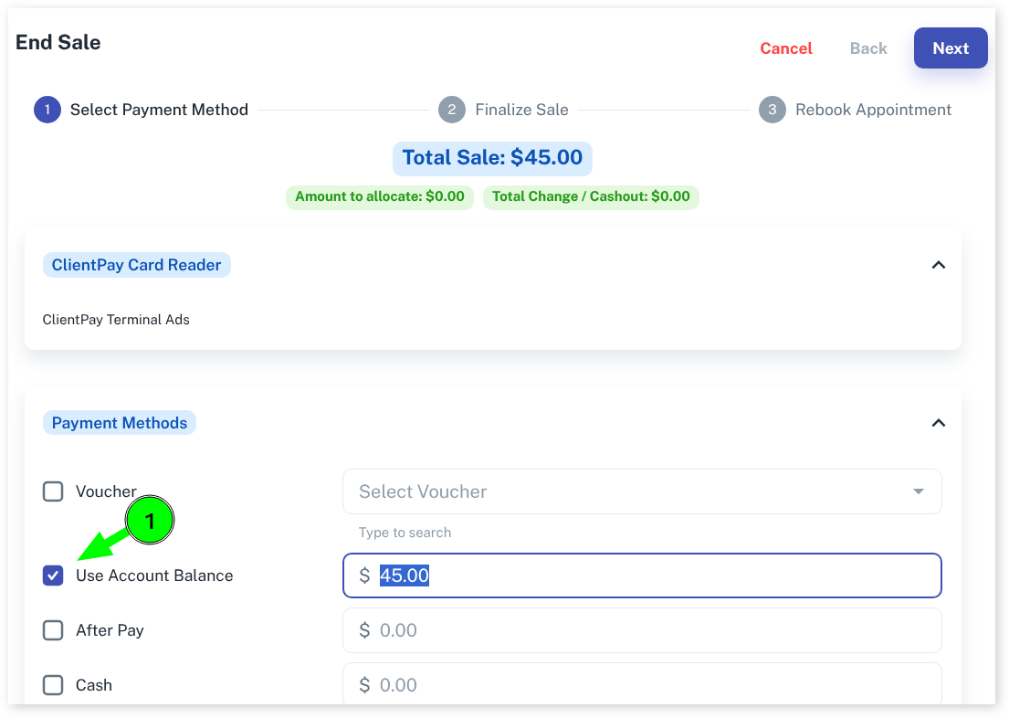 - Select the Use Account Balance option