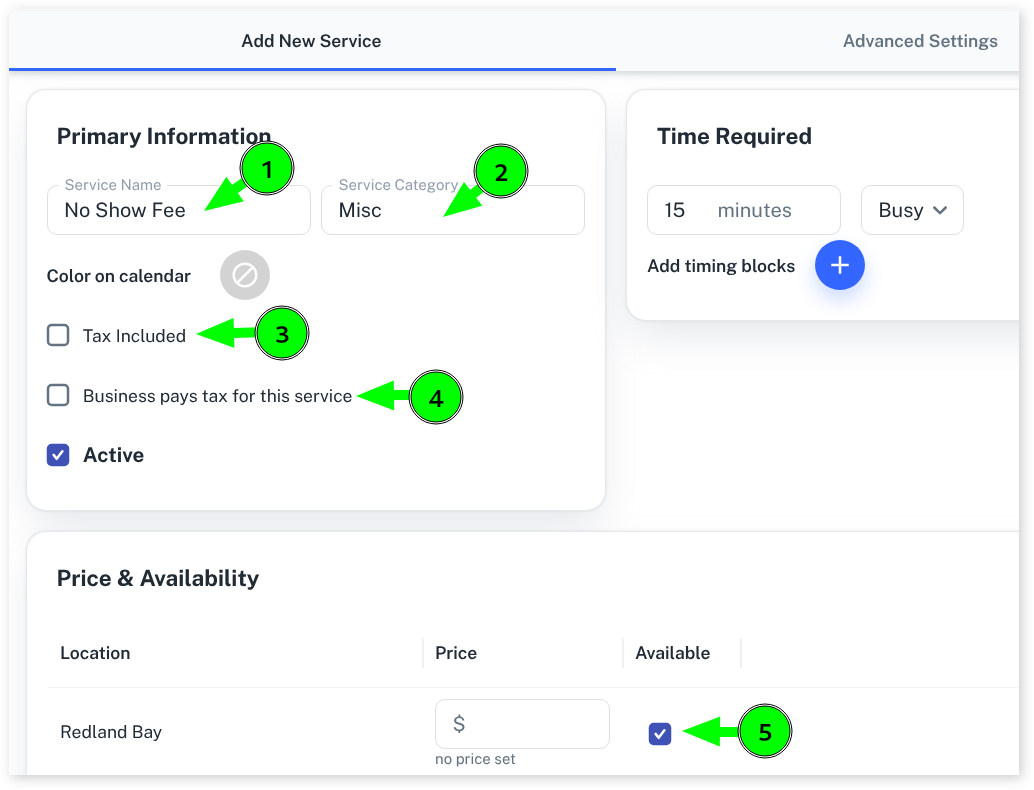 - Enter Service Name and call it something appropriate like “No Show Fee” or similar