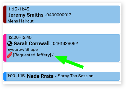 If the client selects a specific employee with their online booking, it will automatically add appointment notes to the booking on the Calendar that they have specifically requested for that employee on their appointment, as shown in the screenshot below.
