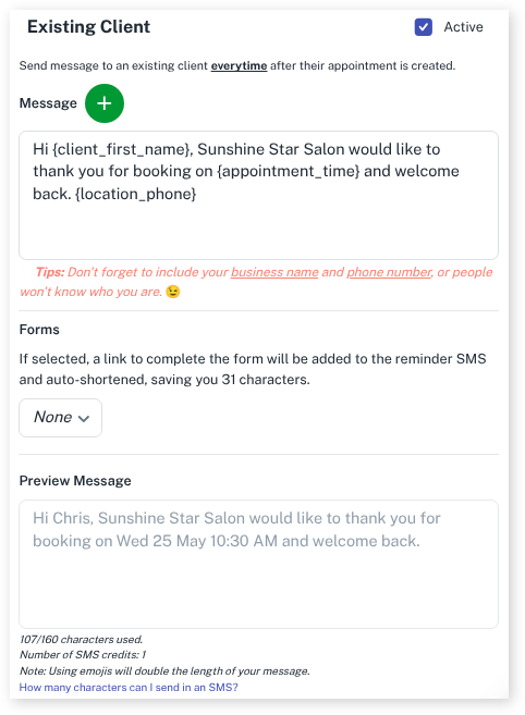 Here is an example using the Client First Name and Appointment Time fields in the Existing Client Welcome SMS.