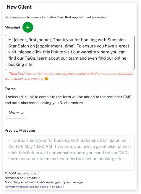 Here is an example using the Client First Name and Appointment Time fields in the New Client Welcome SMS.