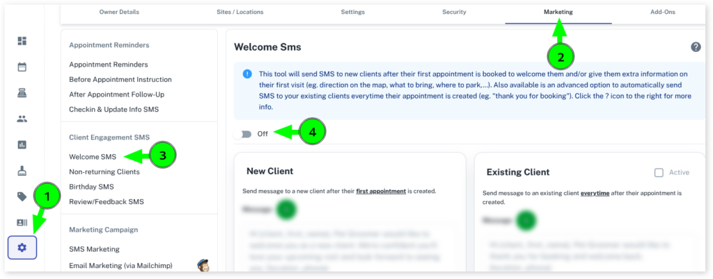 Please note that when you make an existing appointment recurring, the system will look at this as a new booking and send the Existing Client Welcome SMS.