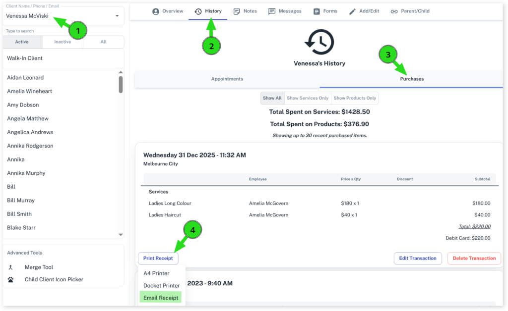 A client may ask for an email of a receipt/tax invoice of a transaction from a previous day.