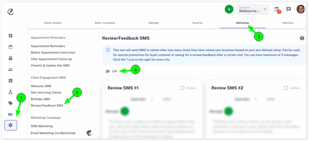 - Enter a number for how many visits after to send the message, by default it is at 3 visits. ( A visit is when a client has an appointment AND is finalised)