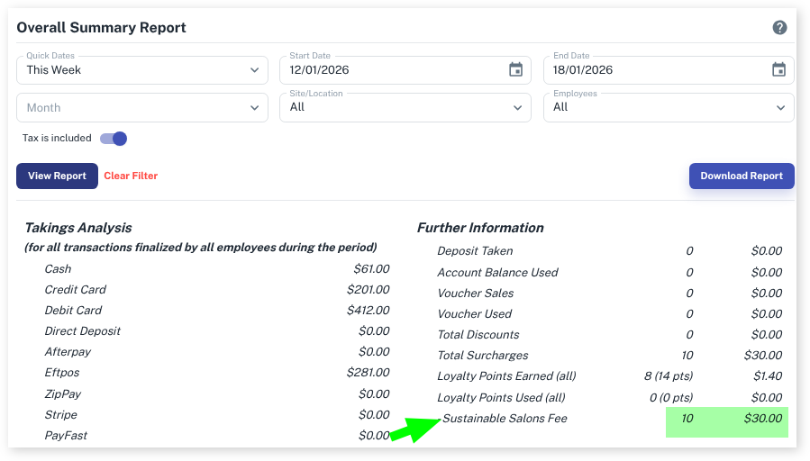 You can check how many Sustainable Salons Fee surcharges you’ve processed over any period of time using the Overall Summary report.