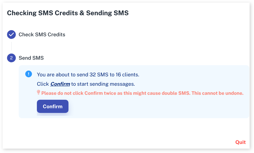 - Note: Please do not click Confirm twice as this might cause double SMS and double spend. This cannot be undone.