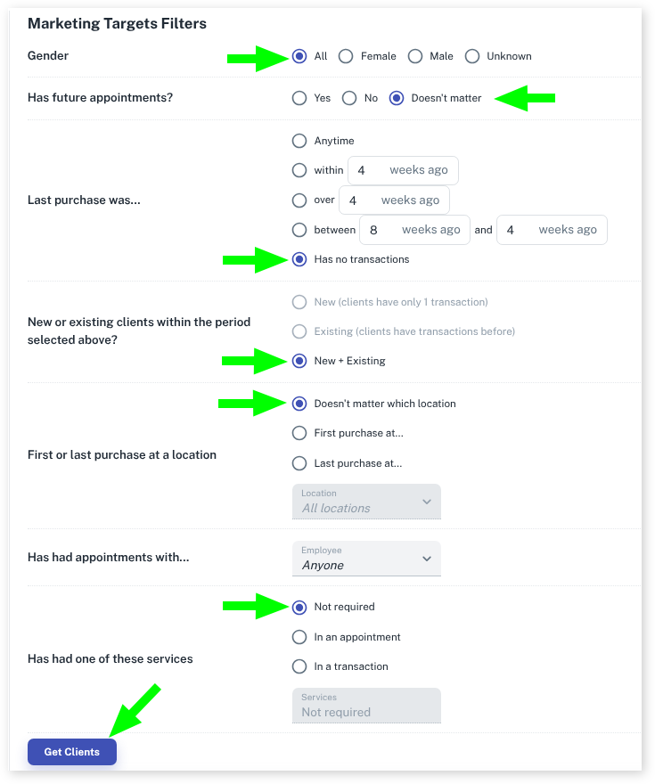 Here is an example of how to market to clients in your database that have no transaction history. These are usually clients that have been imported manually into the system and are yet to visit the business.