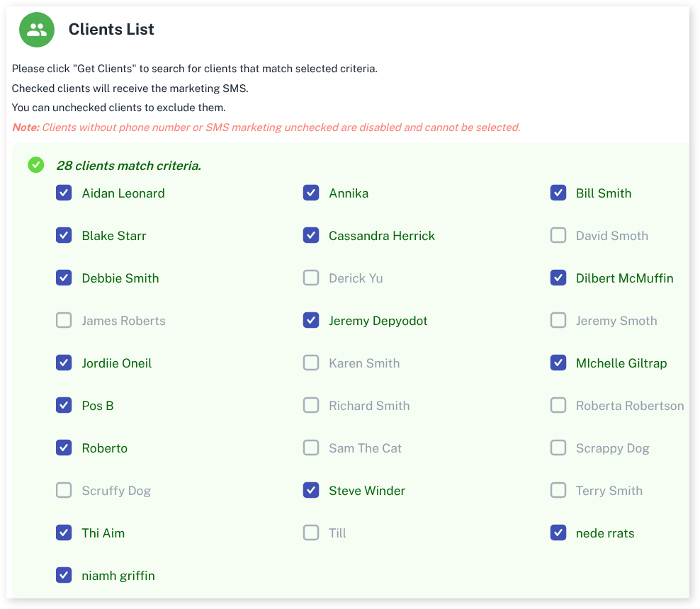 Attention: Before sending any marketing be sure to merge any duplicate clients you may have in the database. This stops clients from receiving messages twice by accident. Documentation on this is here.