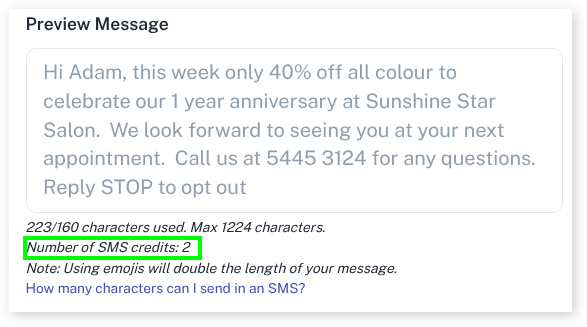 - Enter your message. Note the length of the message in the Preview Message titled Number of SMS. A single length message uses 1 credit. A double length message uses 2 credits. The goal is usually to try your best to keep the text 1 message in length. The below image shows when it’s 2 messages in length.