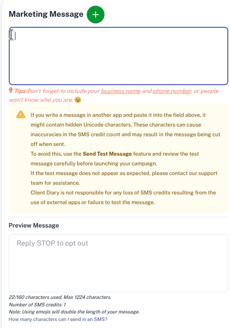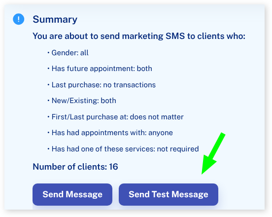 Preview the message and before sending to your clients, we highly recommend sending a test message to your own mobile number.